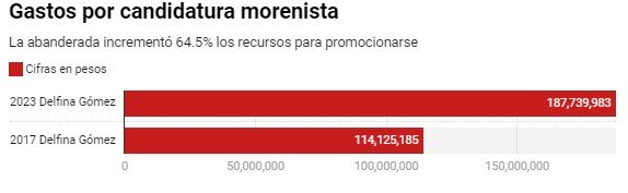 Incluso si se compara el gasto que realizó Delfina Gómez en 2023 con el realizado por ella misma hace seis años. Los reportes muestran que en las elecciones de 2017 se reportaron erogaciones por 114.1 millones, por lo que en este año los morenistas registraron un incremento de 64.5 por ciento en el gasto de operaciones electorales.