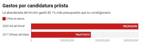 Sin tomar en cuenta la inflación, esta cantidad es 80 por ciento mayor a los 167 millones de pesos que desembolsó en 2017 el entonces candidato del PRI, Alfredo del Mazo.