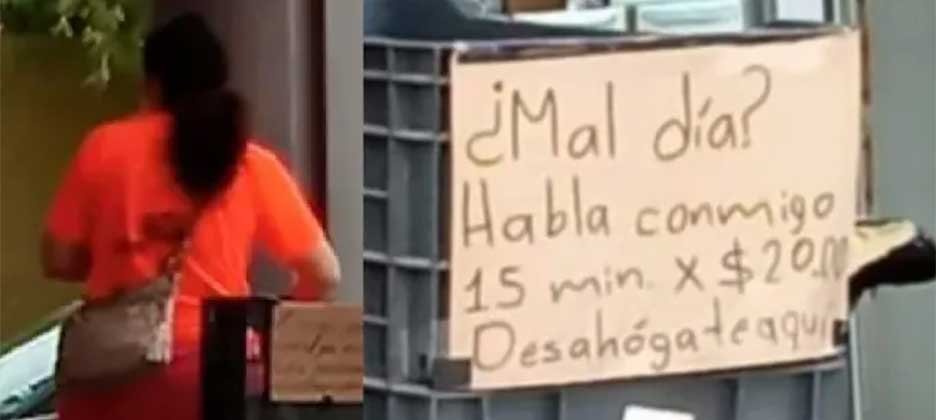 “¿Mal día? Habla conmigo. 15 minutos por 20 pesos. Desahógate aquí”, se lee en el cartel que tiene pegada a la caja”.